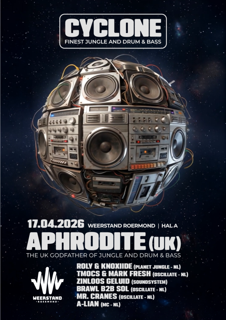 Tijdens CYCLONE wordt Aphrodite bijgestaan door heavyweights uit de Nederlandse scene: de collectieven Planet Jungle en Oscillate. Samen zorgen zij voor een avond vol jungle, neuro en pure drum & bass.